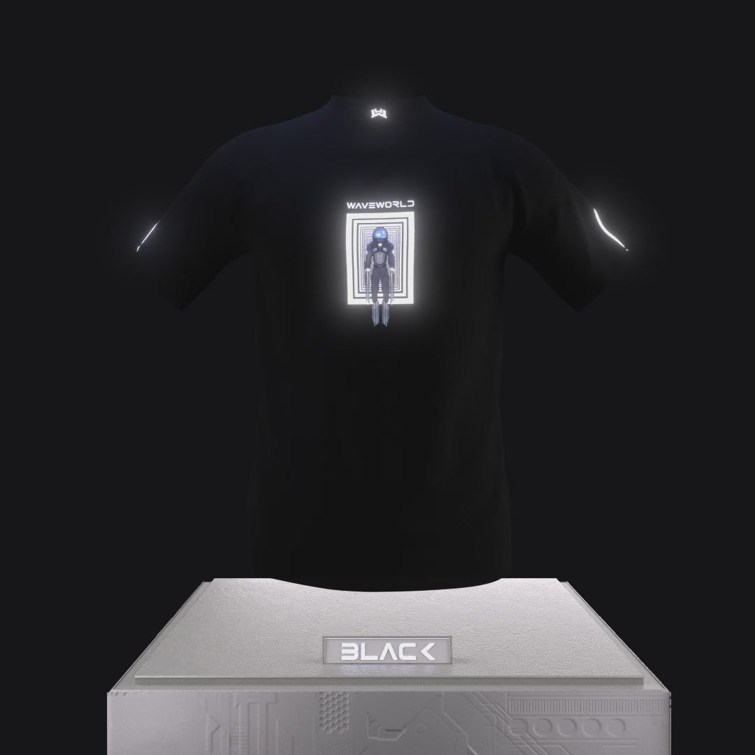 Spaceman design with interactive Augmented Reality (AR) Visual available on top of front illustration. Visit the @waveworld.io Instagram page to try the AR Filter on top of the shirt.